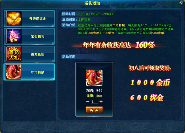 2月7日-2月14日期间,玩家右键点击使用道具“年年有余”,即可获得金币和返利绑金;