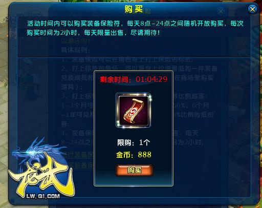 《龙武》官方不惜出资百万,与国内知名保险公司联手投保玩家的游戏装备,凡是买了保险的装备都能在被回收之时获得由官方支付的高达150%的保险赔偿费!对于一些为了兄弟朋友而不得已要换区舍弃装备的玩家来说,装备保险将会是他们减少换区损失的一大福音!
