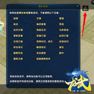 (2)授权后的账号将绑定一个【授权密码】,使用【授权密码】登陆该账号,账号下的角色,默认无法使用交易、商城购买、邮寄、改名换性等功能;