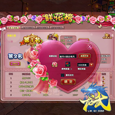 (2)玩家在【商城】购买鲜花后,可点击【鲜花榜】的【送鲜花】按钮,给自己的好友或排行榜当中的玩家送花,当送出“999玫瑰花”或“亲亲宝贝”时,世界所有玩家屏幕将出现绚丽的花语或爱心的光效;