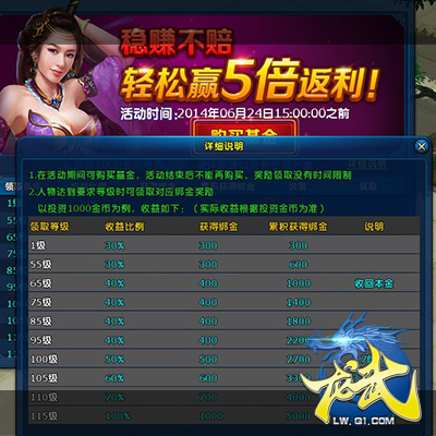 4、新增【5倍返利】成长基金活动,活动期间,玩家进行金币投资购买基金,到达相应的等级时将得到相应的绑金奖励,投资越多回报越多,最高可得5倍收益。ps:成长基金活动每个角色只能购买一次