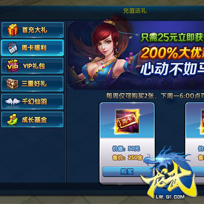 5、新增【充值送礼】综合界面,将【首充大礼】、【周卡福利】、【VIP礼包】、【成长基金】等活动迁移到【充值送礼】界面,各活动的当前状态保持不变。