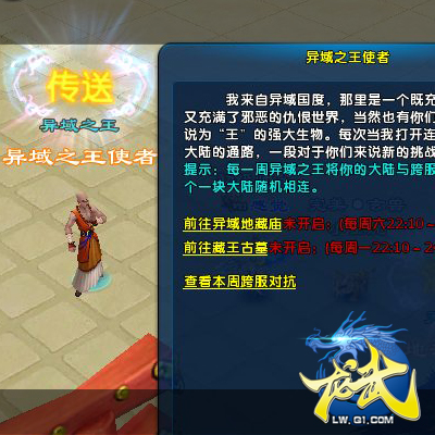 (1)每周六22:10-24:00开启【异域地藏庙】,每周一22:10-24:00开启【藏王古墓】,90级及以上玩家可在【长安】NPC【异域之王使者】(24,11)进入副本,进入后BOSS将在22:30分刷新;