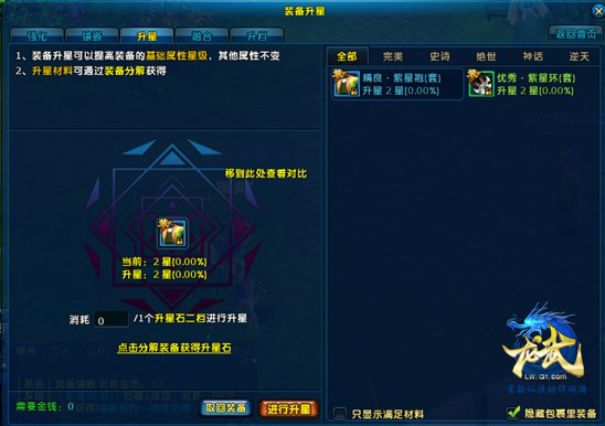 装备强化到一定阶段即可进行“升星”系统的操作,装备的升星可以提高装备的基础属性星级,继续提高装备的威力。操作需要的材料为升星石,而获得升星石的办法更简单,把那些没用的装备分解一下就行了。