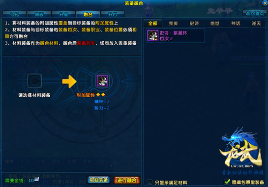 但是,在《龙武》中升档不会提升装备附加属性。于是玩家一定会想,有没有什么办法在进行升档的操作后一定会有疑问,怎样才能让套装装备获得很好的附加属性?游戏里为玩家准备了贴心的“融合”系统。融合时,需准备好主装备和材料装备,融合后,材料装备将消失,主装备的全部附加属性会被替换为材料装备上原先带有的更牛的附加属性。通过“融合”系统,玩家要打造属于自己的个性化强大装备可谓是随心所欲。