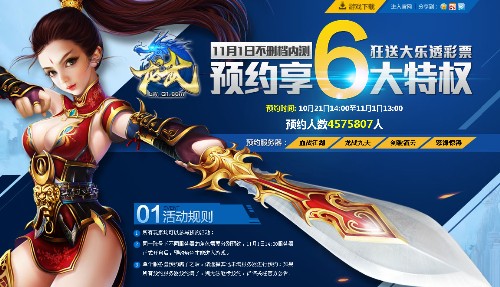 首款仙侠动作网游《龙武》11月1日14:00不删档内测,新服预约正式开启。在预约期间,所有参与新服角色预创建预约的玩家,都将享有大乐透网络彩票、预约VIP礼包等六重大奖。