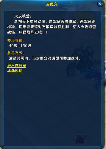 火攻粮营是一个很考验玩家策略与心态的活动,在每周三、五的19:55-20:25,40级以上的玩家可以通过封庭义NPC参加火攻粮营!他属于经验类活动,有此需求的玩家一定不要错过!