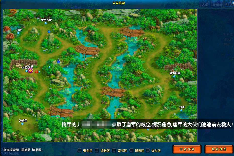 所有参加活动的玩家会被分成两个阵营,分别为“隋军”与“唐军”。在20分钟内,玩家与战友合作抢夺火把,然后烧毁敌军三个粮仓就可获得胜利。如粮仓均未烧毁,则看哪个阵营的余量多,则算获胜。如果余粮也一样,则是杀人数量多的一方取得胜利。否则平局。