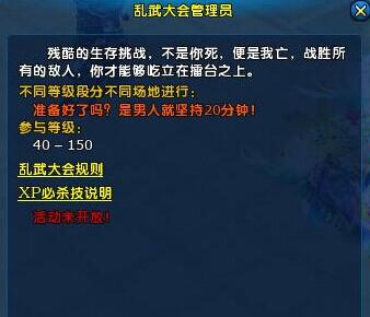 40级以上玩家可在长安乱武大会管理员处报名参加比赛。正式比赛开始前,如果报名人数小于2人,则此次比赛取消。竞技场内有专用的免费的竞技药水可供使用,不限次数和数量,但是该药水仅限在乱武大会使用。