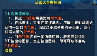 乱武大会除了专用药水外,还会为玩家提供专用的XP必杀技。玩家使用XP必杀技需要消耗杀气值。在比赛中,只要处于竞技场内,每隔一段时间都会获得杀气值,如果击败对手或被对手击败,都将获得大量杀气值。当杀气值达到技能要求,则屏幕中央会自动出现善良的XP必杀技图标。点击即可释放。