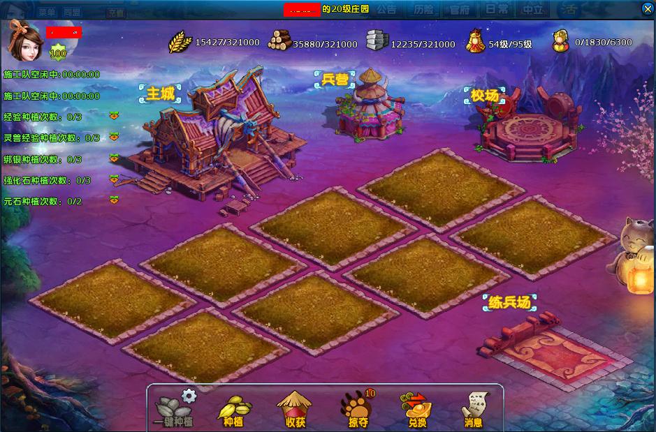庄园可以收获人物经验、宠物经验、绑银、强化石和原石。经验暂且不提,另外的绑银、强化石和原石是非常划算的。VIP等级玩家可以增加种植次数。以下截图可以看到可以种植的作物,种豆得豆,种瓜得瓜!