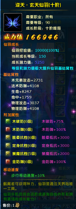 仙羽等阶越高,移动速度加成越多,一阶仙羽加成1%,二阶仙羽加成2%,三阶仙羽加成3%……仙羽威力值可通过以上打造来提高。