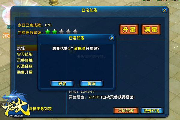 日常任务是60级以上玩家可以领取的任务,完成可获得经验奖励。在任务列表里一共有五个任务类型可供选择,其中“杀怪”为固定选择之一,其他几个可以刷新——需要消耗一定的银两。任务有星级的差别,星级越高奖励当然也就越高,满星为五星,可用“逐鹿令”和金币进行升星。每个玩家的日常任务每天只能做6次。