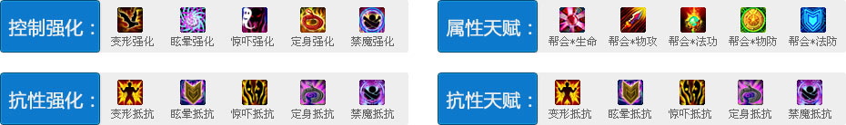 帮会技能分为两大类。第一类无需研究,成员消耗帮会贡献学习,简称为"帮会技能";第二类无需学习,帮会消耗建设度研究,这类称为"帮会天赋"。个人学习的帮会技能分为"控制强化"和"抗性强化";帮会天赋分为"抗性天赋"和"属性天赋"两类,包含帮会技能里抗性类的七种技能和五种人物属性(生命、物攻、法攻、物防、法防)。